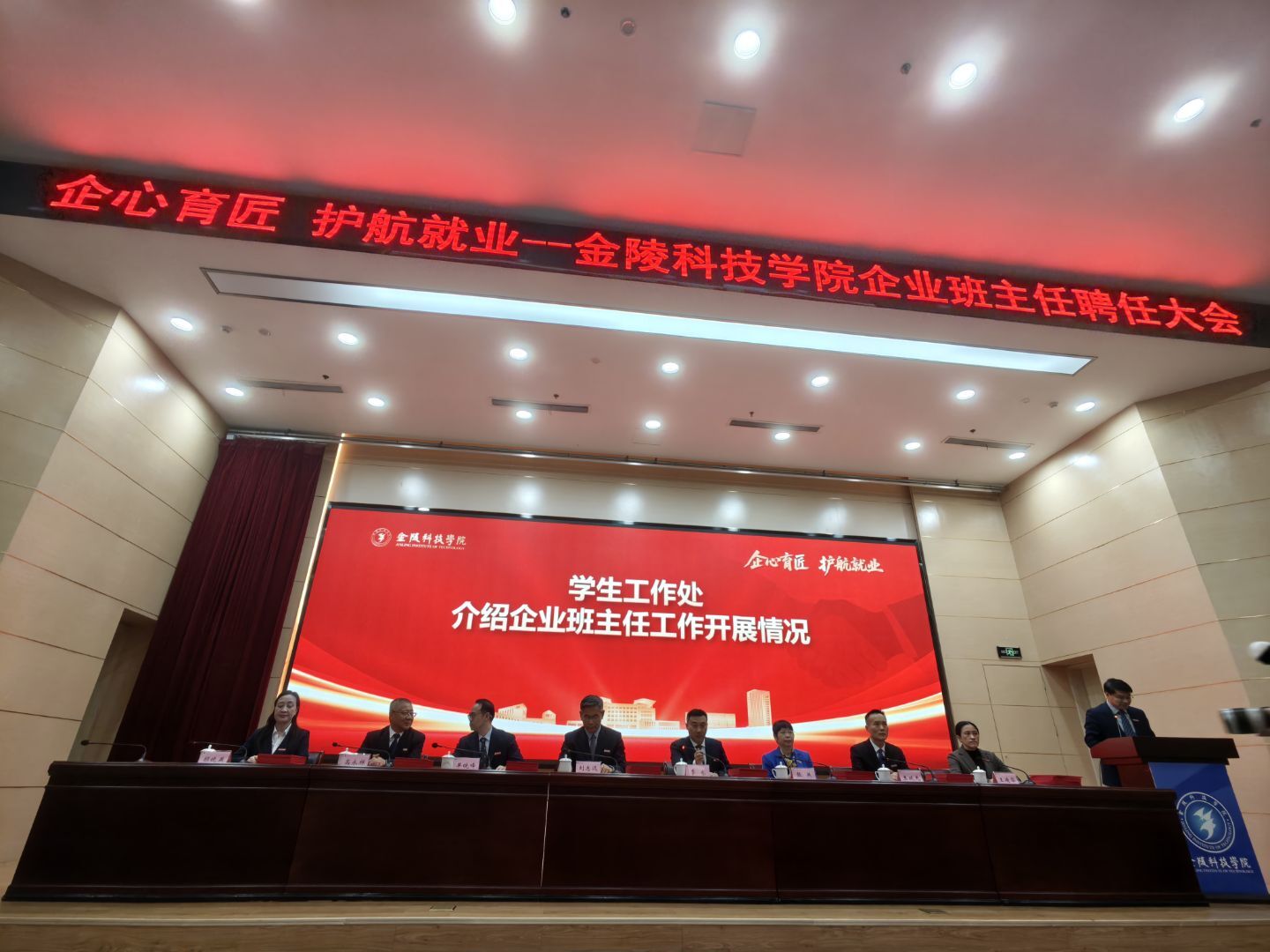2025年11月26日,金陵科技学院企业班主任聘任大会在金陵科技学院科技楼报告厅举行。江苏贝斯特全球奢华科技(集团)股份有限公司唐佩、徐敏博、罗涛、孙文雅同志受聘金陵科技学院软件学院企业班主任,并随后在学院组织下,参观金陵科技学院科创空间,参加学院研讨会。