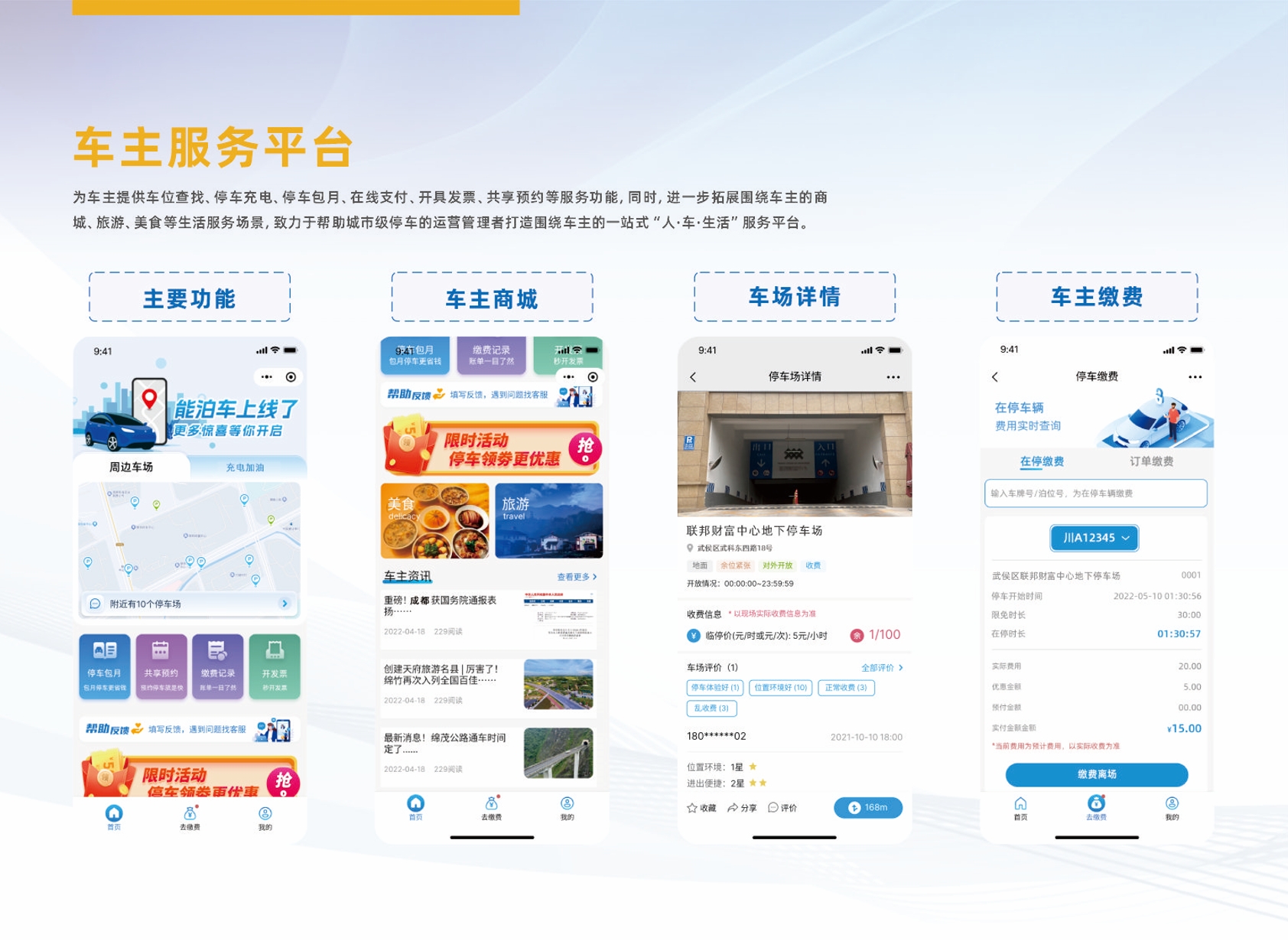 车主服务平台为车主给予车位查找、停车充电、停车包月、在线支付、开具发票、共享预约等服务功能,同时,进一步拓展围绕车主的商城、旅游、美食等生活服务场景,致力于帮助城市级停车的运营管理者打造围绕车主的一站式“人·车·生活”服务平台。
