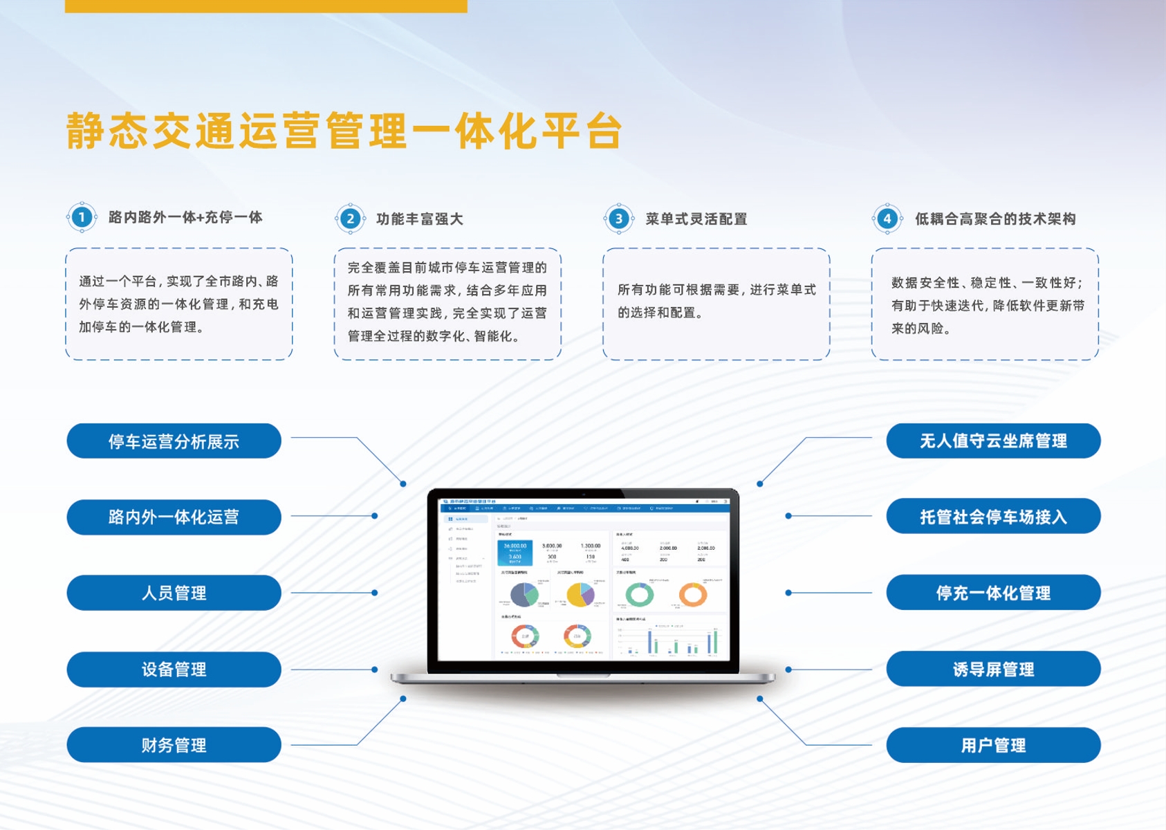 静态交通运营管理一体化平台具有“路内路外一体化+充停一体化管理”、“功能丰富强大”、“菜单式灵活配置”、“低耦合高聚合技术架构”等显著特点。
